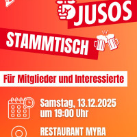 Komm zum Juso-Stammtisch am 13.12.2025! Wir treffen uns im Restaurant Myra in FFB um 19:00. Anmeldung ist nicht erforderlich. Wir freuen uns auf dich!